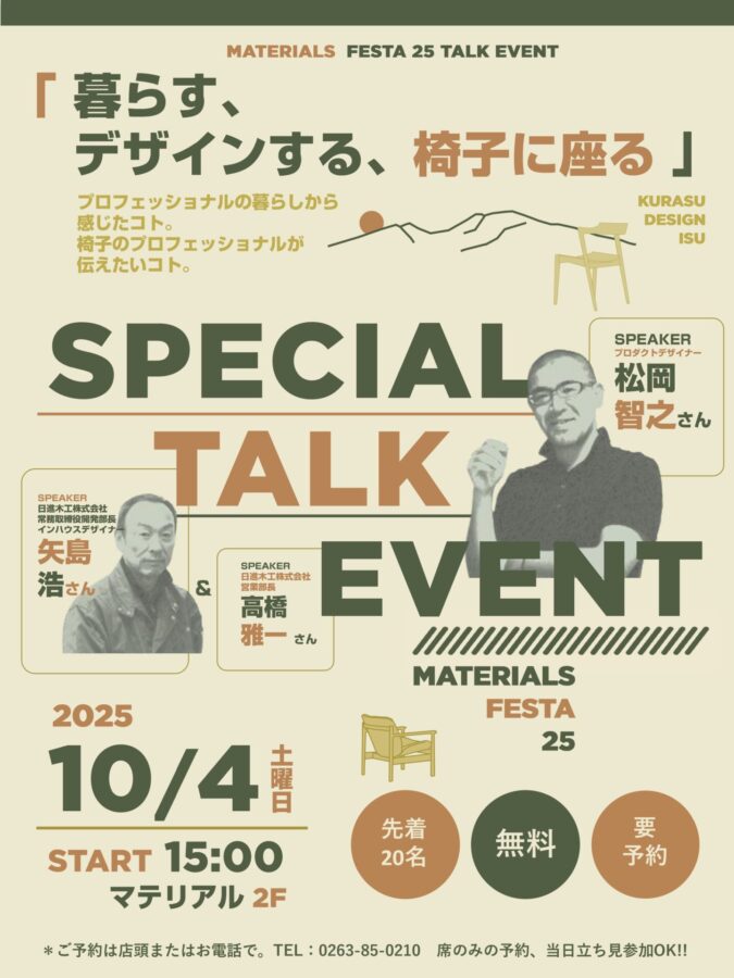 プロフェッショナルが暮らしから感じたこと、椅子のプロフェッショナルが伝えたいことなど、「暮らし」「デザイン」「椅子に座るということ」をテーマにお話しをしていただきます。