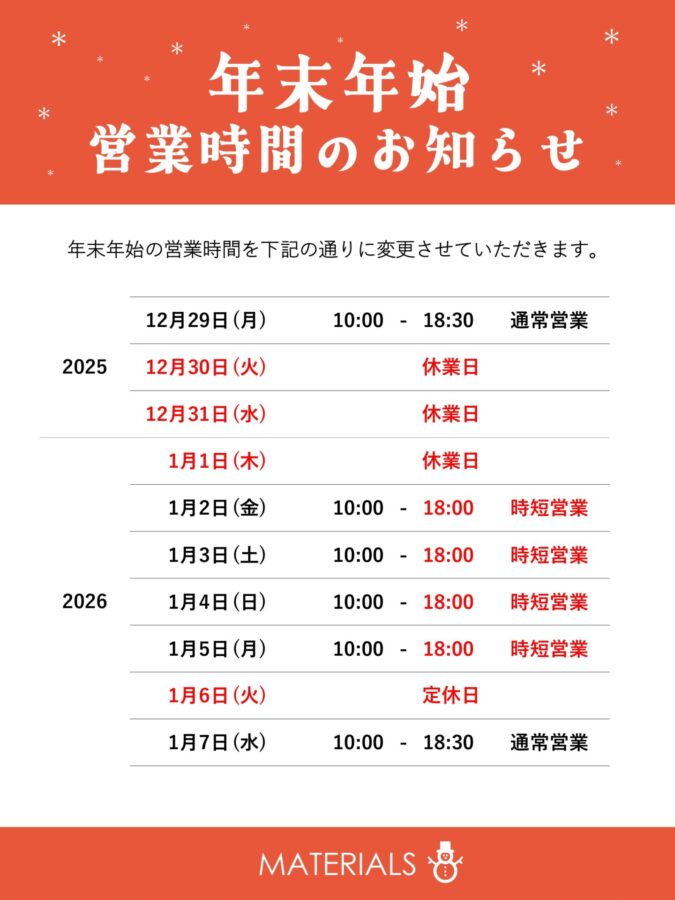 年末年始 営業日・時間のお知らせ 2025.12.19 平素はご愛顧賜り、誠にありがとうございます。誠に勝手ながら、年末年始の休業日、営業時間を下記の通りとさせていただきますのでよろしくお願いいたします。MATERIALS WINTER SALE 12/19(fri)~START!!