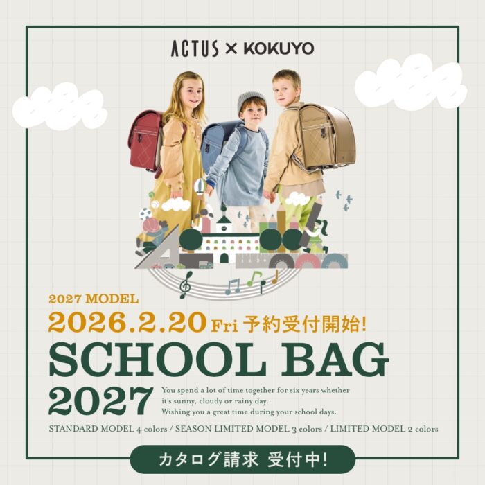 2027年度ご入学用のアクタス スクールバッグのご予約が、2026年2月20日(金)よりスタート!!新しい学びの旅をスタートするお子さまにぴったりの、機能性とデザインを兼ね備えたバッグとなりました。丈夫で使いやすく、お子さまの成長に合わせたアイテムが勢ぞろい。おしゃれで楽しい学校生活のスタートを、心を込めてサポートします。
