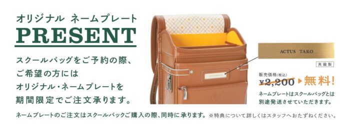2026年5月31日(日)までにスクールバッグをご予約の方はオリジナルネームプレートをプレゼント!真鍮製のネームプレートはバッグを開くたびに自慢したくなってしまうかも。期間限定の特別特典です。
